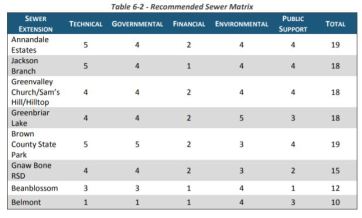 - The number of EDUs in which this sewer extension could serve was derived from the Brown County RSD report. In their report they estimate that 276 EDUs are currently in the Town of Bean Blossom, and approximately 60 additional EDUs along Greasy Creek Road. See Appendix A, Figure 5-5, for a map of this sewer extension. The engineer’s opinion of probable project costs is $6,283,000. p32.